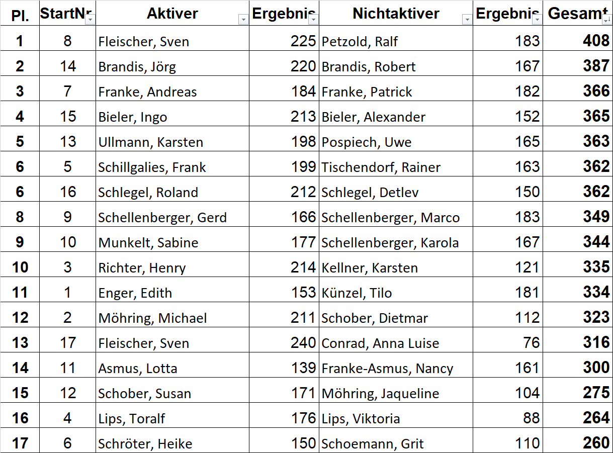Pl. | StartNr. | Aktiver | Ergebnis | Nichtaktiver | Ergebnis | Gesamt |