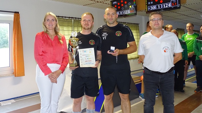 Per Los wurden die Startbahnen ermittelt. Im ersten Durchgang lagen die Ergebnisse noch eng beieinander. Max Flemming von der SG Zechin spielte mit 573 Kegeln einen neuen U18-Bahnrekord. Die Führung übernahmen die Sportkegler Markranstädt knapp vorm SV Leipzig. In Durchgang zwei kratzte der Leipziger Philipp Oelschlägel mit 592 Kegeln schonmal an der 600er Marke. Leipzig übernahm mit 3 Holz Vorsprung die Führung. Für das Heimteam durfte U18-Spieler Max als neues Mannschaftsmitglied die ersten Wettkampferfahrungen sammeln. Nach der dritten Bahn des dritten Durchgangs war bereits klar, dass der Einzelbahnrekord der Männer fallen würde. Sportfreund Tobias Schröder egalisierte den alten Rekord von 602 Kegeln und stellte mit 665 Kegeln einen neuen Bahnrekord auf. Damit holten sich die Markranstädter die Führung zurück. Auf der Heimbahn erspielte Michael Möhrig mit 574 Holz den Bahnrekord bei den B-Senioren. Im vorletzen Durchgang fiel wieder ein Bahnrekord. Nikita Pohl holte sich diesen mit 625 Kegeln in der Altersklasse U23. Die Turnierführung übernahmen jetzt erneut die Leipziger. Jedoch holten sich am Ende die Sportkegler Markranstädt mit neuem Mannschaftsbahnrekord von 3501 Kegeln den Turniersieg. Zum Abschluss eines langen Wettkampftages durften wir noch die Naunhofer Bürgermeisterin Anna Luise Conrad begrüßen, die Vereinspräsident Sven sowie Vize und Sportwart Lutz tatkräftig bei der Siegerehrung assistierte und den Siegerpokal und die Gastgeschenke überreichen durfte. Zur Erinnerung an dieses Jubiläumsturnier erhielten die Gastmannschaften je eine Silber-Gedenkmünze zum 800jährigen Stadtjubiläum.