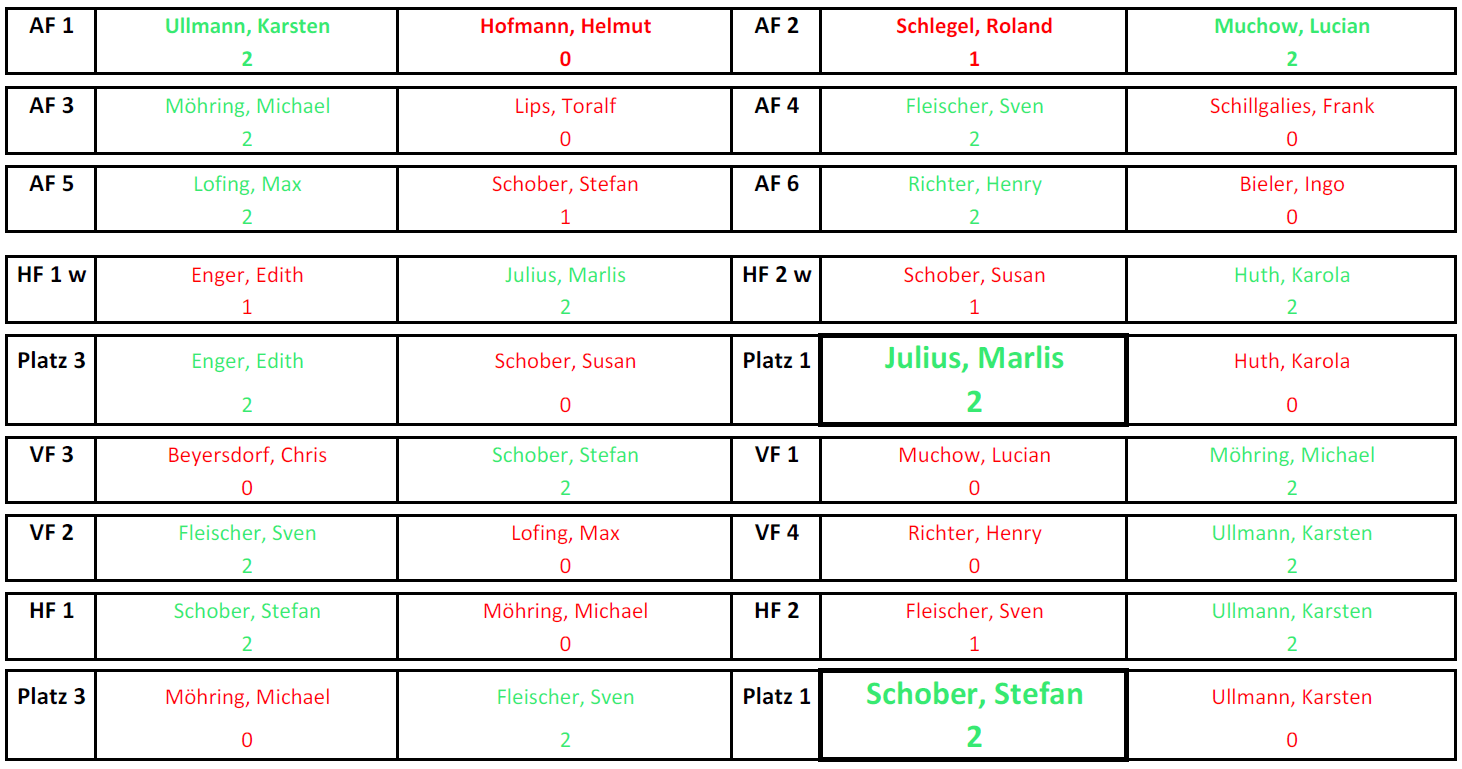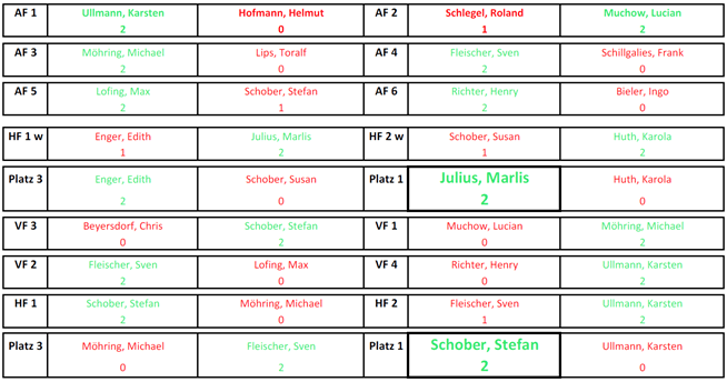 Im ersten Viertelfinale verlor Quali-Sieger Chris gegen Stefan, der als Lucky Loser, also als bester Verlierer der Achtelfinals, doch noch weiterkam. Lucian schied zeitgleich gegen Micha aus. Präsi Sven setzte sich mit 2.0 Sätzen gegen Max durch und Henry schied gegen Karsten aus. Im Anschluss setzte sich Stefan gegen Micha durch, während das zweite Halbfinale zwischen Sven und Karsten erst nach Stechen mit 1:2 endetet. Sven siegt dann im Spiel um Platz 3 deutlich gegen Micha. Stefan, nur als Lucky Loser weitergekommen, holte sich zum zweiten Mal in Folge den Vereinsmeistertitel.